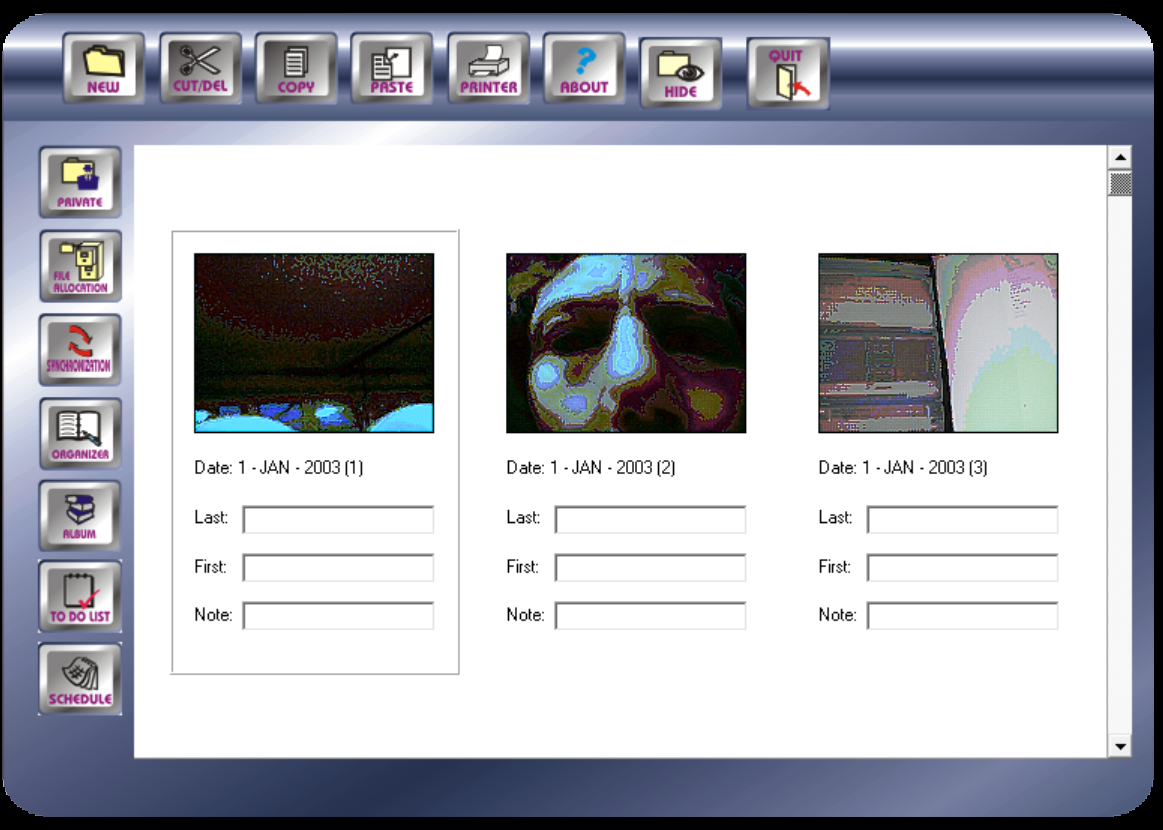It's impossible to overstate the charmingly half-baked '90s energy of this masterpiece (preserved at the Internet Archive; here is a sample data file with photos). The synchronization feature is eminently polished: you get clear instructions, an accurate progress bar, robust retry, and error handling. But the main window isn't draggable: after launch, the program lays claim to an arbitrary place on the screen and establishes itself therein. Dragging doesn't work; the window stays there until closed.