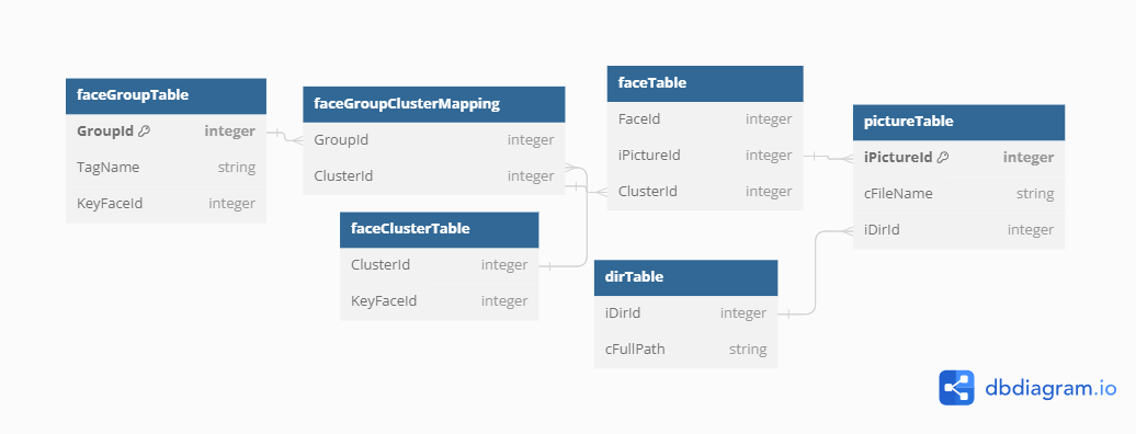 pictureTable and dirTable on iDirId and concatenate the cFullPath and cFileName columns.pictureTable, faceTable, faceGroupClusterMapping, and faceGroupTable together. The face name is in the TagName column.Putting it all together, here's a query to find all images containing all of the listed people:
